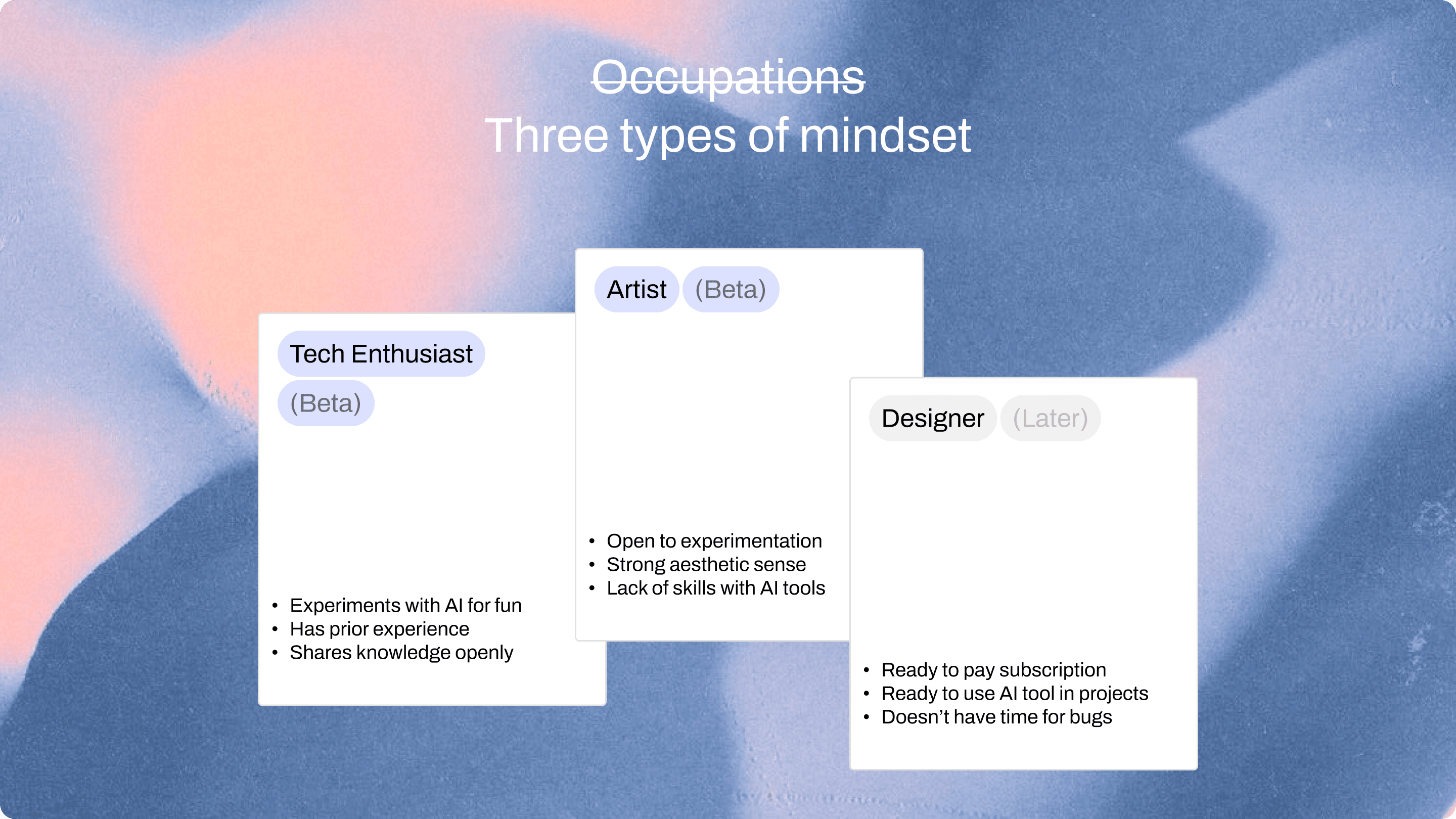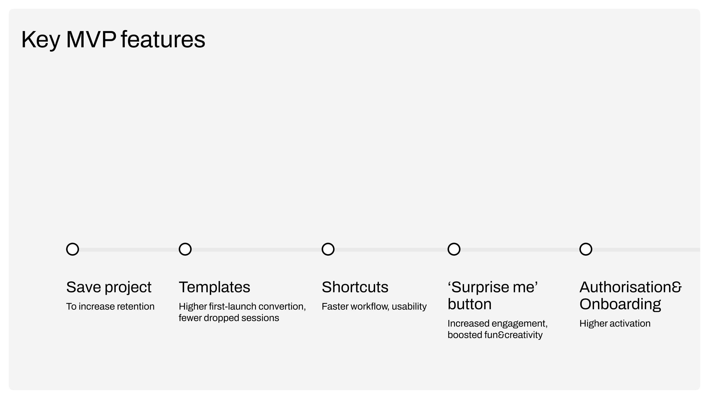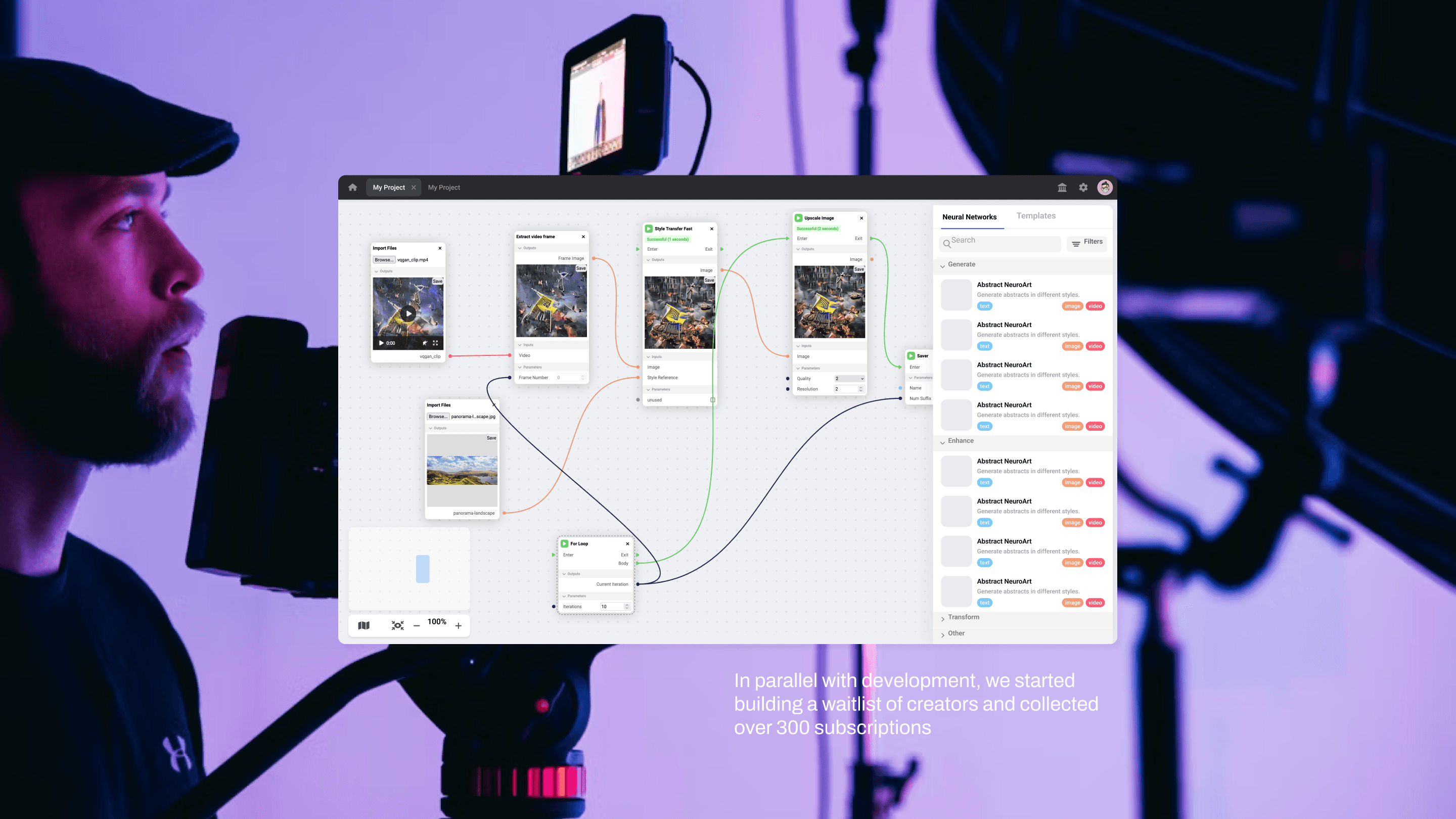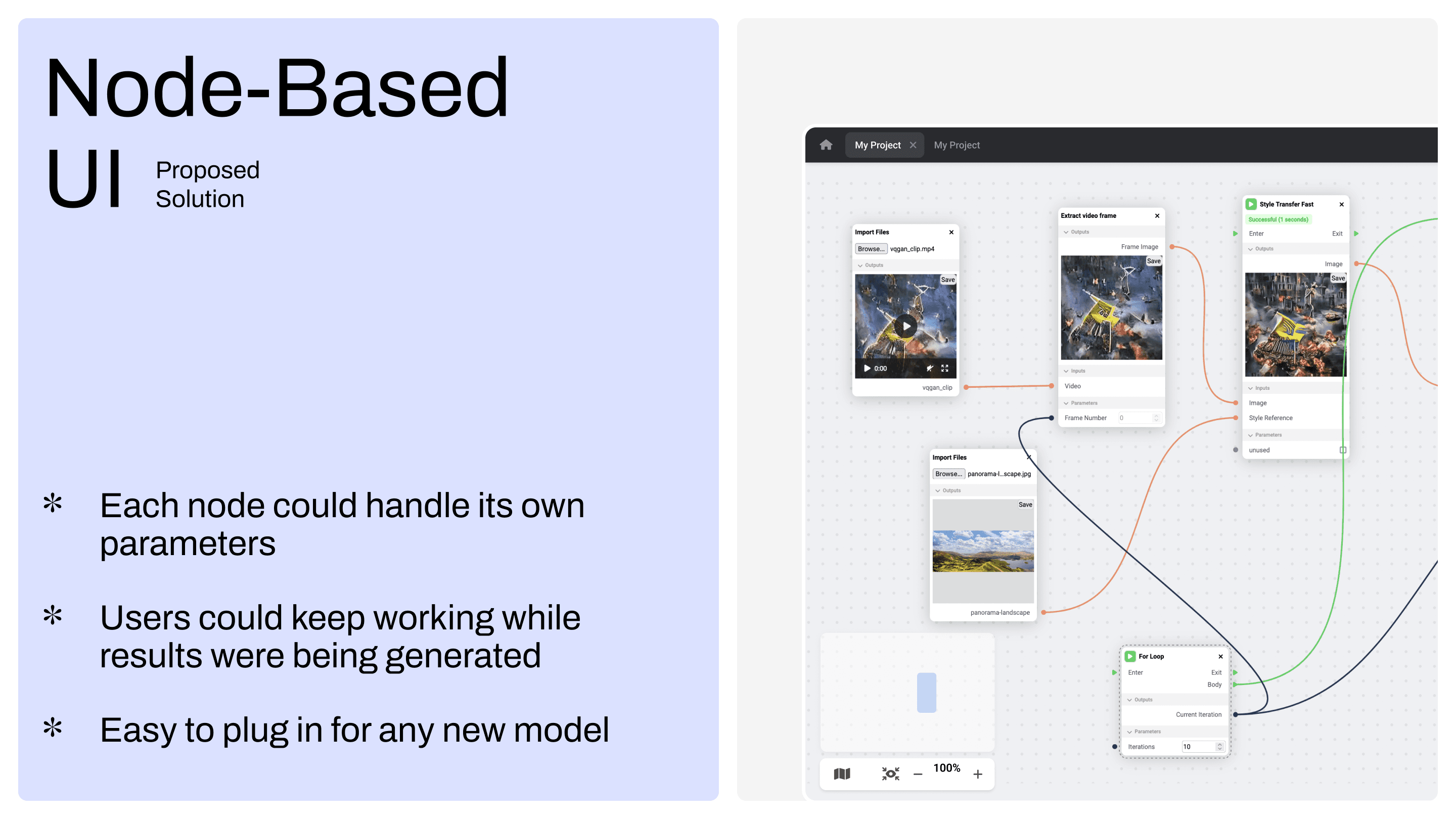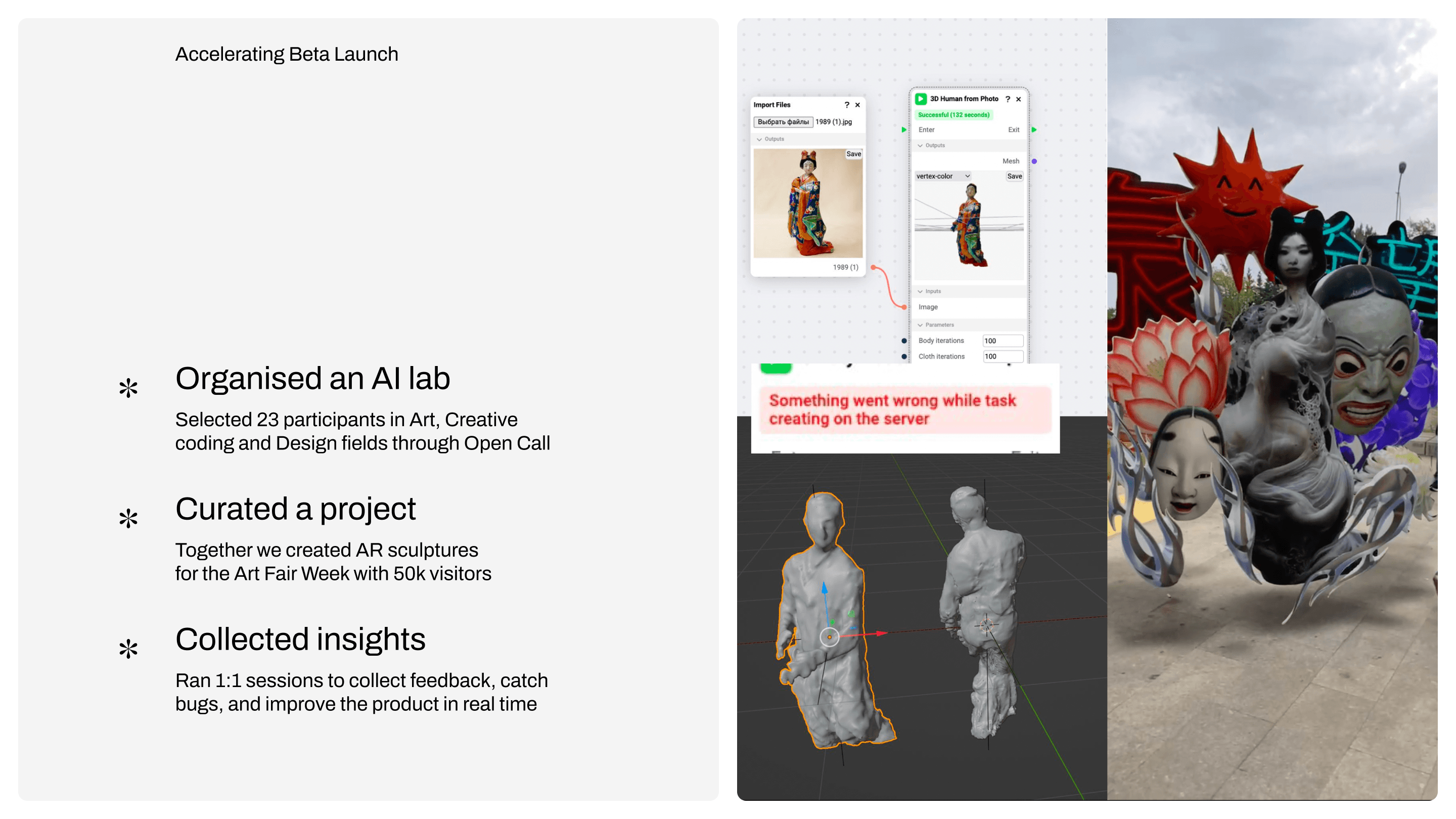 Research (Neural Networks, Market, User), Discovered Use Cases, Node-based Approach, User Testing, Pitch Deck, UI/UX core flows, Beta Launch